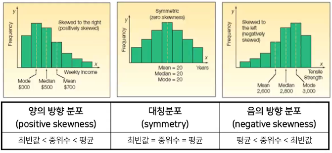 -자료집단이 대표치를 중심으로 좌/우 쪽으로 치우쳐 있는지 치우쳤다면 얼마나 치우쳐 있는지